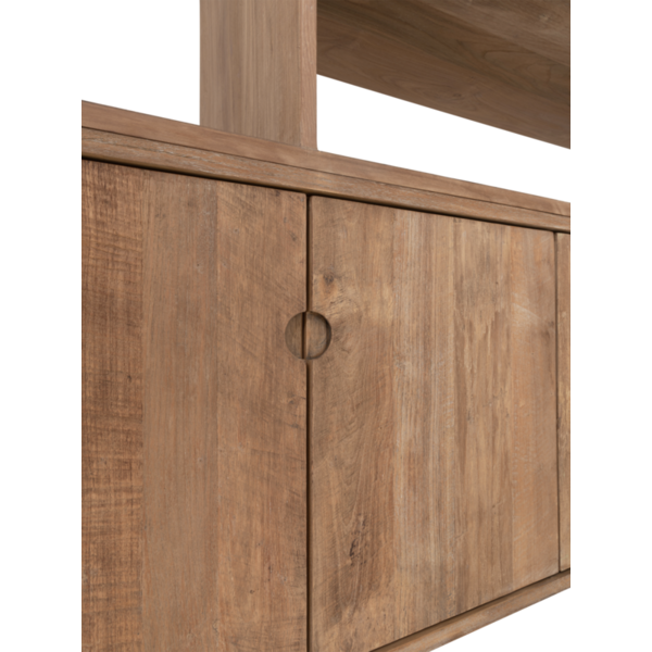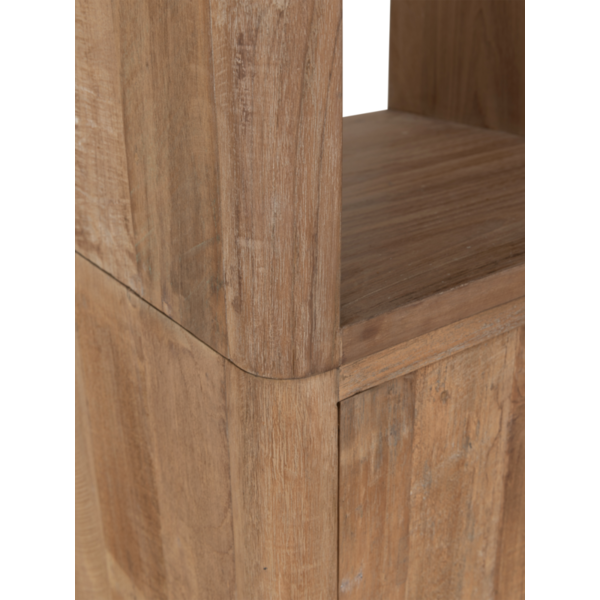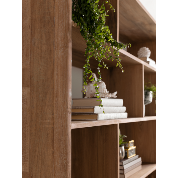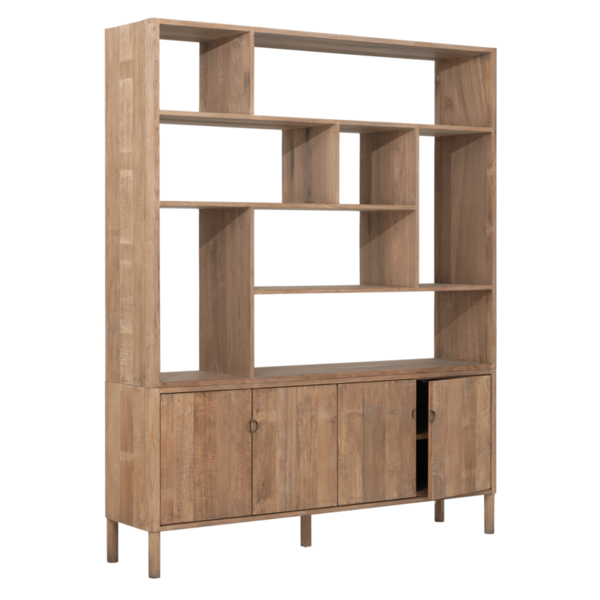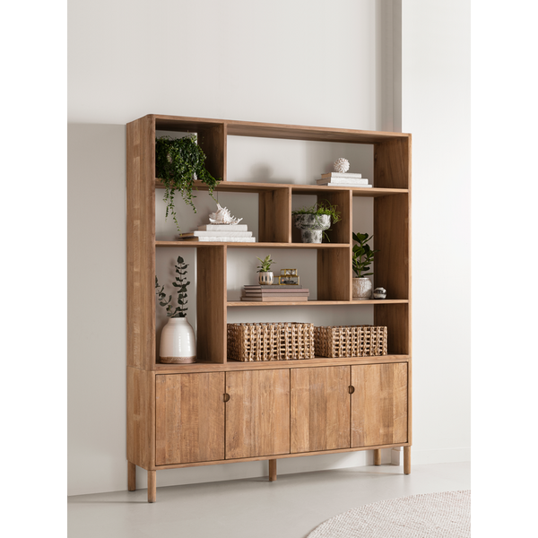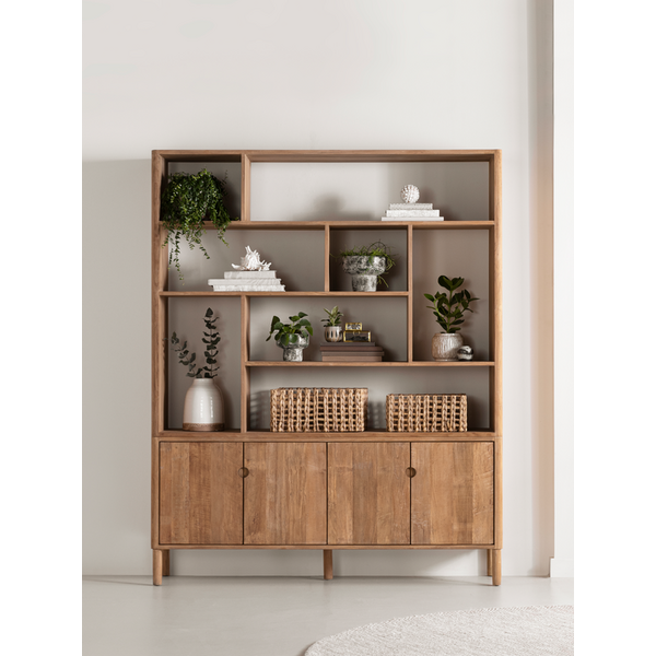 The playful rhythm of open and closed compartments gives this bookcase a dynamic yet balanced look. Rounded corners, recessed handles and slightly set-back doors add depth and refinement to the clean design.