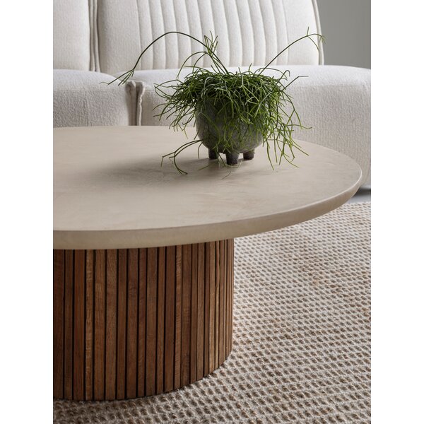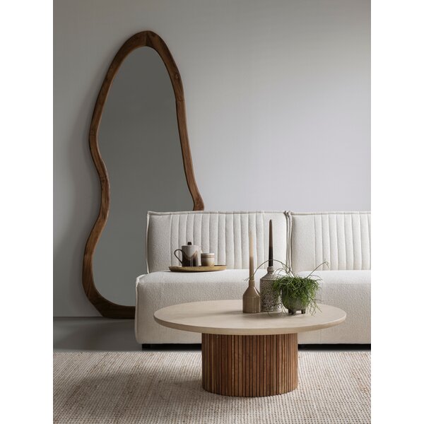 Coffee table Lagoon is designed as a calm and inviting centrepiece for the living space. The Lagoon tables feature elegant Mortex or recycled teakwood tops supported by a single round wooden column with slats, creating a balanced and timeless look. Soft rounded edges enhance the comfortable character, giving the table a warm and harmonious presence.