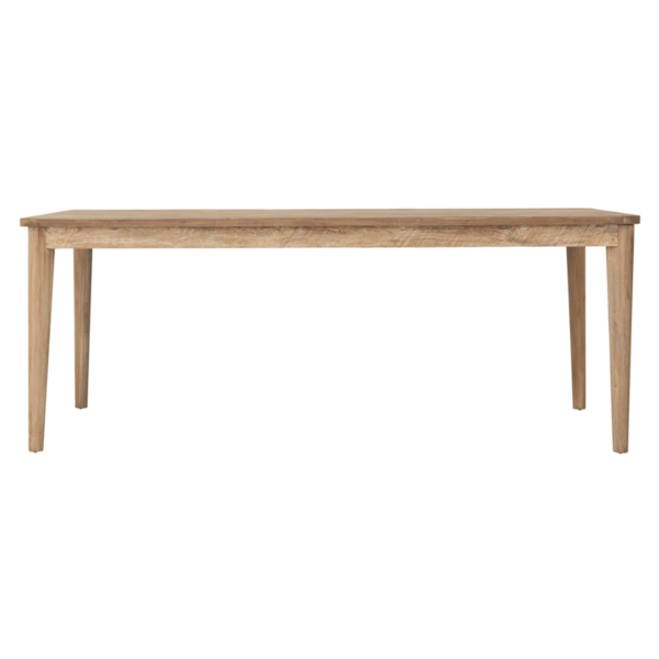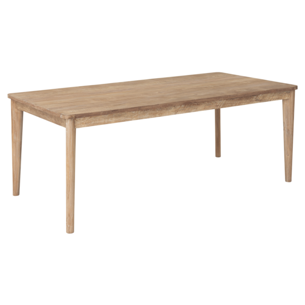 Dining table Apollo highlights the natural character of natural teak. With soft rounded corners and tapered legs placed at the very edge, it offers both visual lightness and generous seating space.