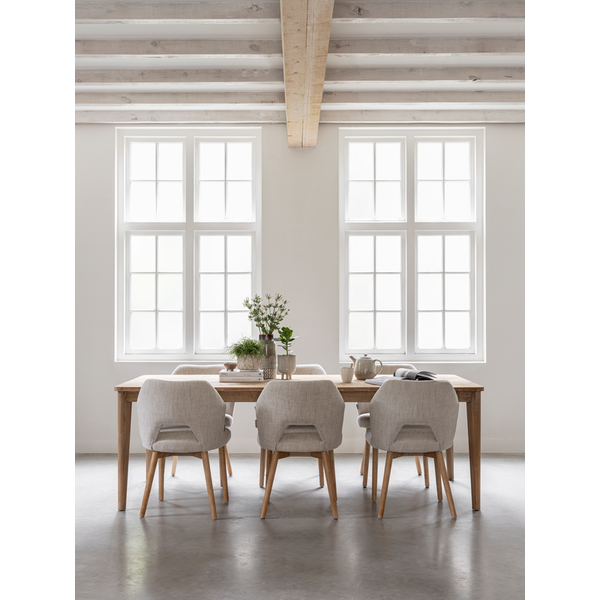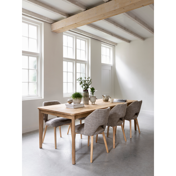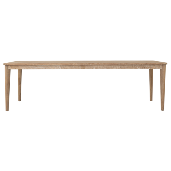 Dining table Apollo highlights the natural character of natural teak. With soft rounded corners and tapered legs placed at the very edge, it offers both visual lightness and generous seating space.