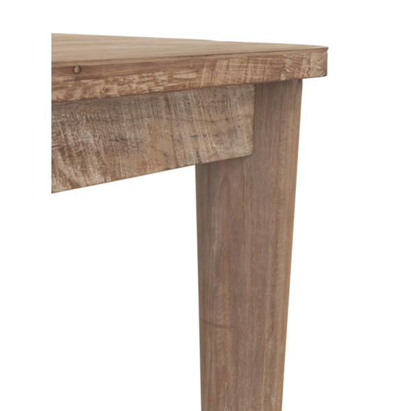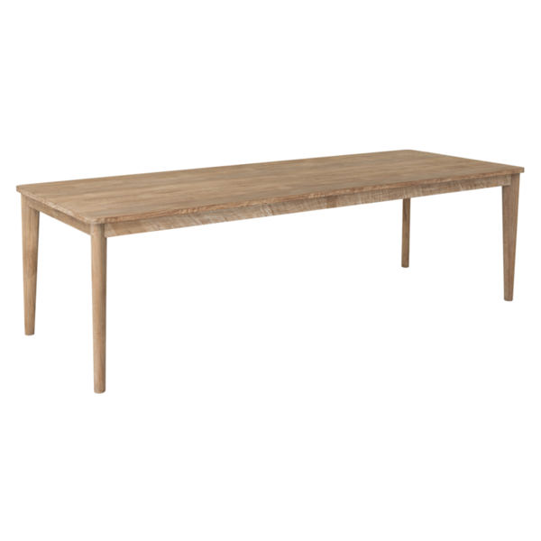 Dining table Apollo highlights the natural character of natural teak. With soft rounded corners and tapered legs placed at the very edge, it offers both visual lightness and generous seating space.