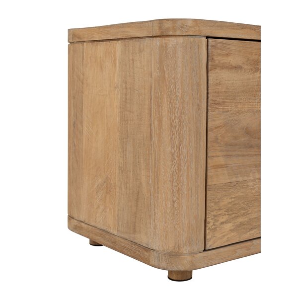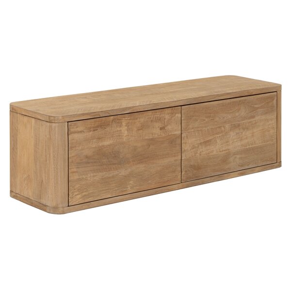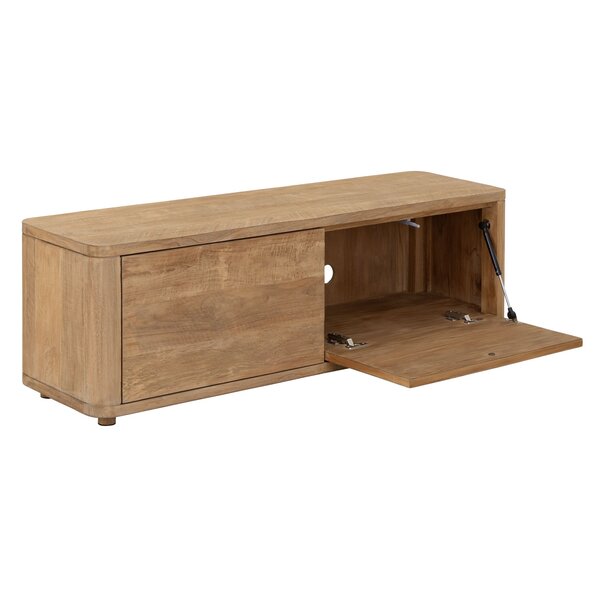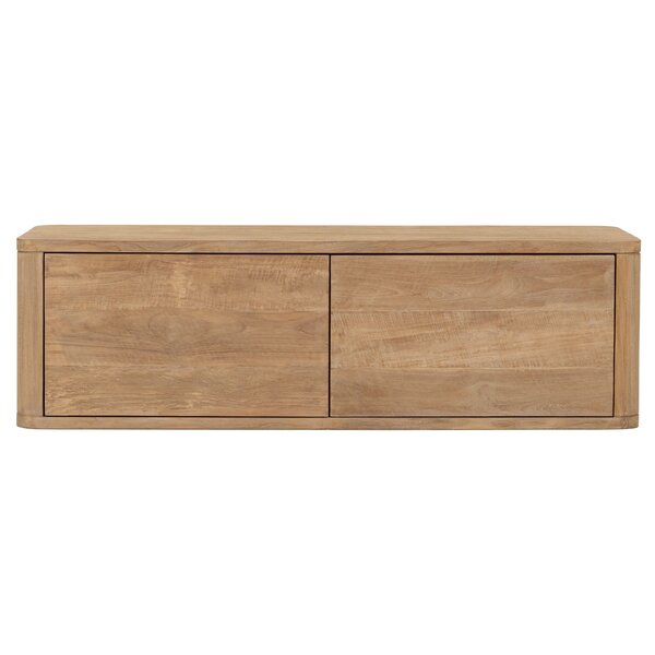 TV stand Nova features flap doors and is available in teak or with a travertine top. It comes standard with both legs and a wall-mounting system, allowing freestanding or wall-mounted use.