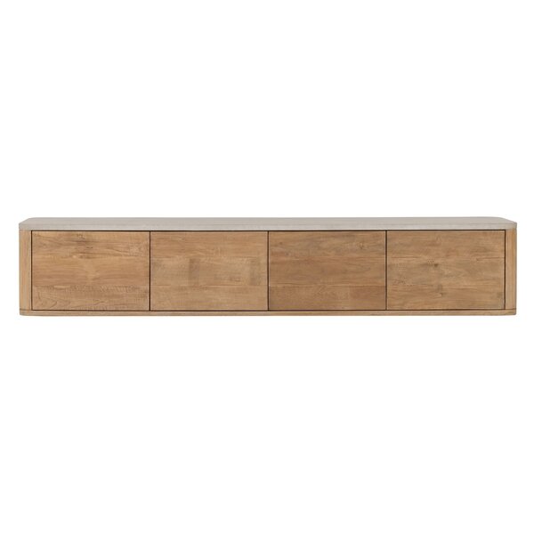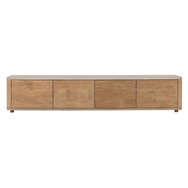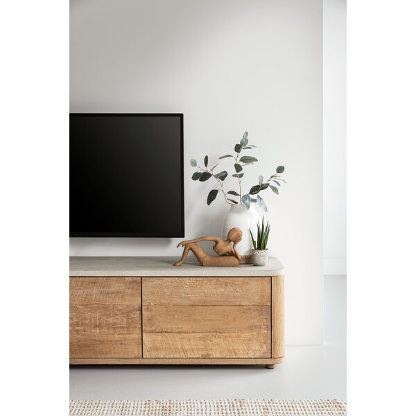 TV stand Nova features flap doors and is available in teak or with a travertine top. It comes standard with both legs and a wall-mounting system, allowing freestanding or wall-mounted use.